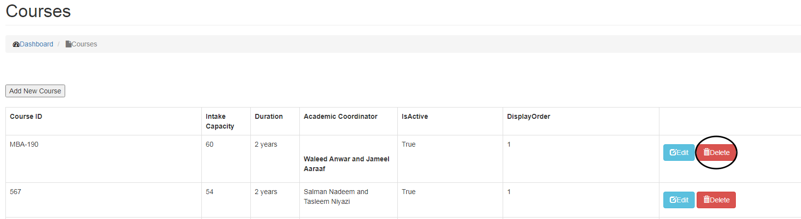 In Course section, you will be able to see all the courses that have been added in course section and add new course by clicking on Add New Course button.