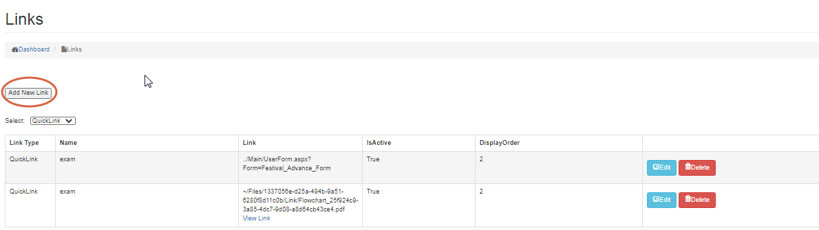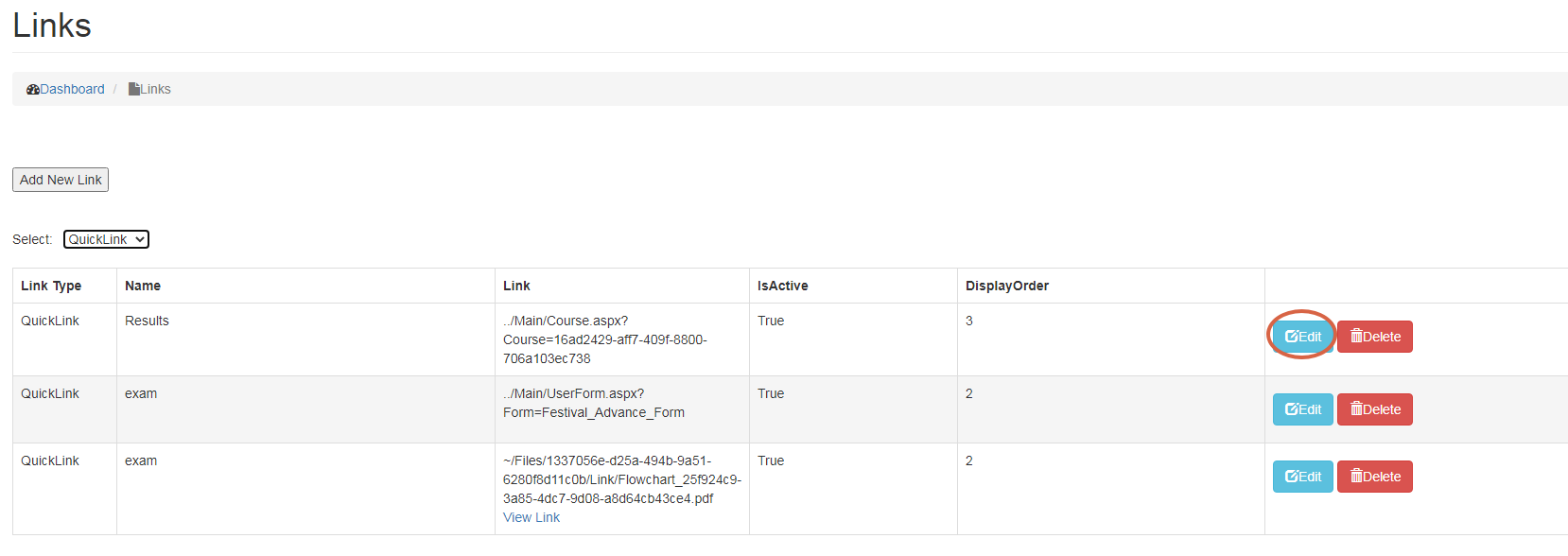 Select displays links which have been added to the website, by Choosing desired link (Quick Link, Download and Footer Link) from the drop down menu.